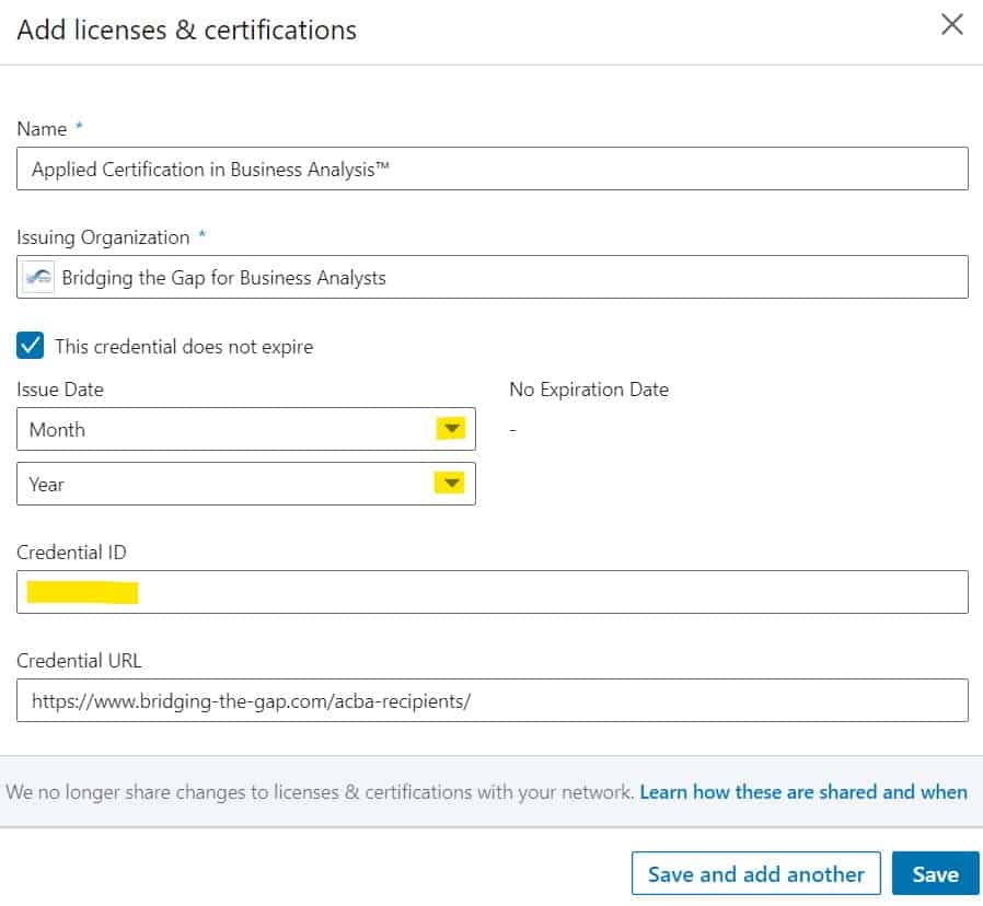 There are several ways you can highlight your new certification on LinkedIn. Here is a menu of different options. They all show up in different places, so no matter how someone finds you or what part of your profile they see first, they will know you have a business analyst credential.